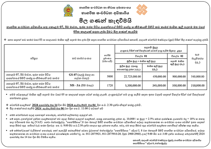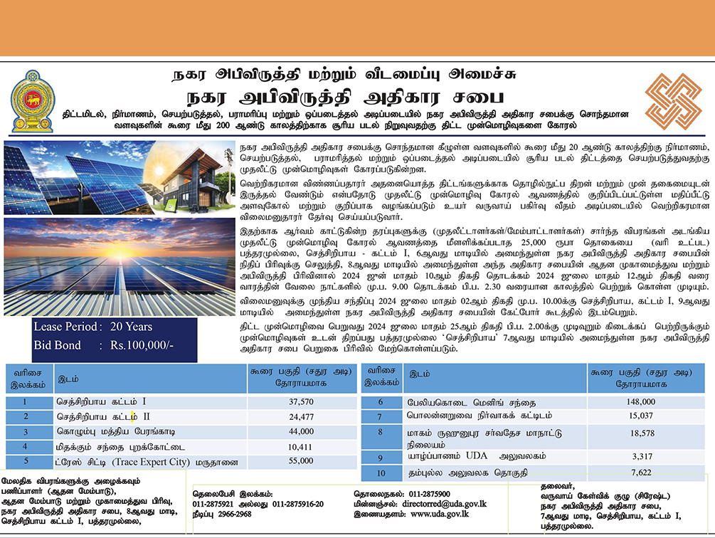 - Calling Tender for Mixed Development Projects at Sellakataragama