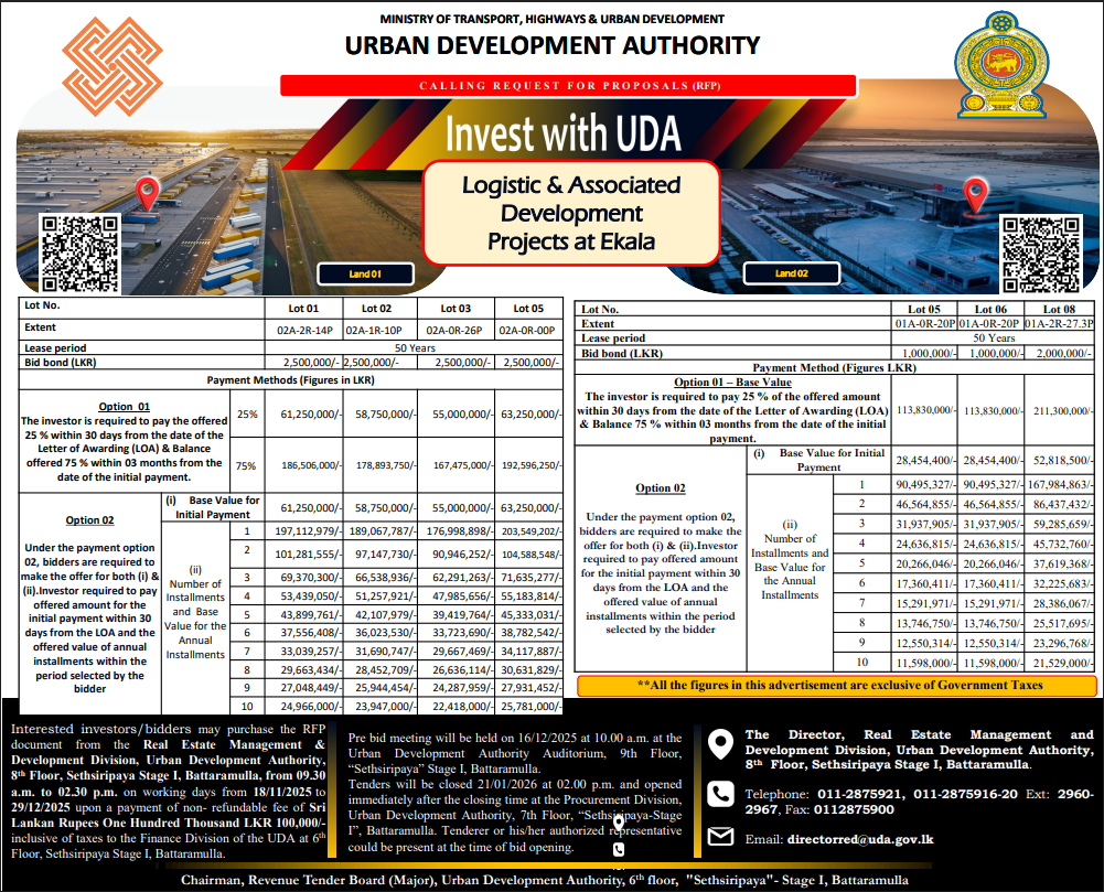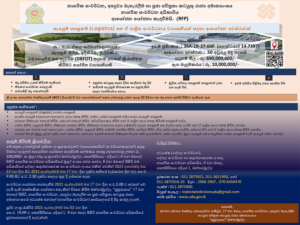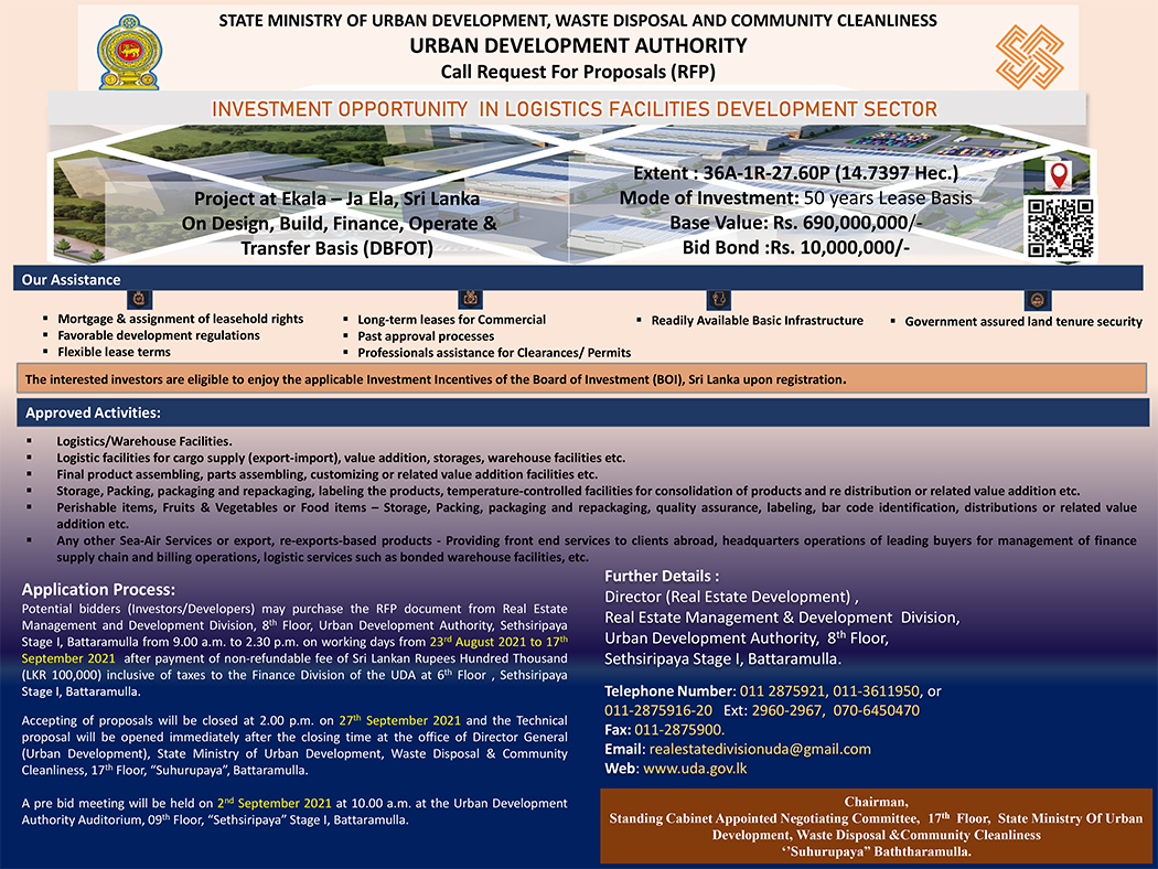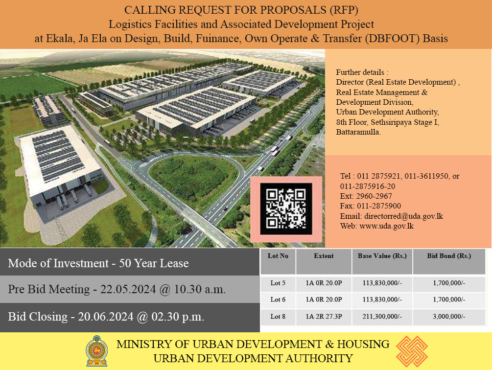 - Logistic Facilities and Associated Development Project at Ekala, ja Ela on Design, Build, Finance, Own Operate & Transfer (DBFOOT) Basis