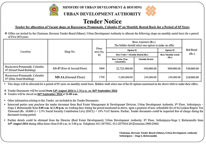 - Calling Request for Proposals - Tender for allocation of Vacant shops at Racecourse Promenade, Colombo 07 on Monthly Rental Basis for a Period of 05 Years